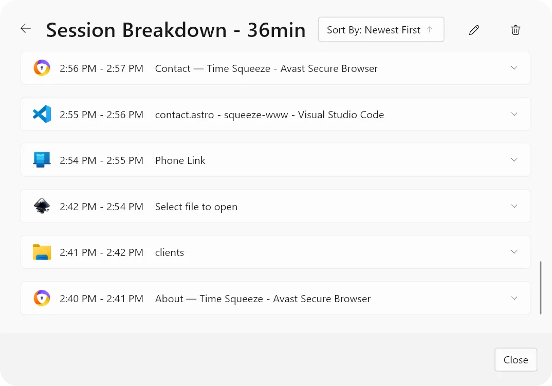 Time Squeeze tracks the time you spend on websites or individual files. You can easily see every time a website or file was opened and how much time you spent on it. In addition you can quickly jump to these files in the Windows Explorer. Click any activity to see these details.
