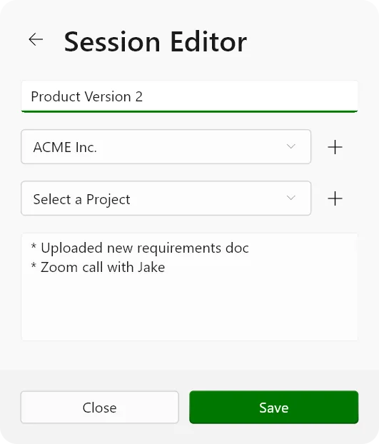 Sessions can be tagged and categorized based on client and project. In addition, you can add notes to your sessions and change session names. You can easily create client and project overrides for specific activities or mark them as 'not billable'.
