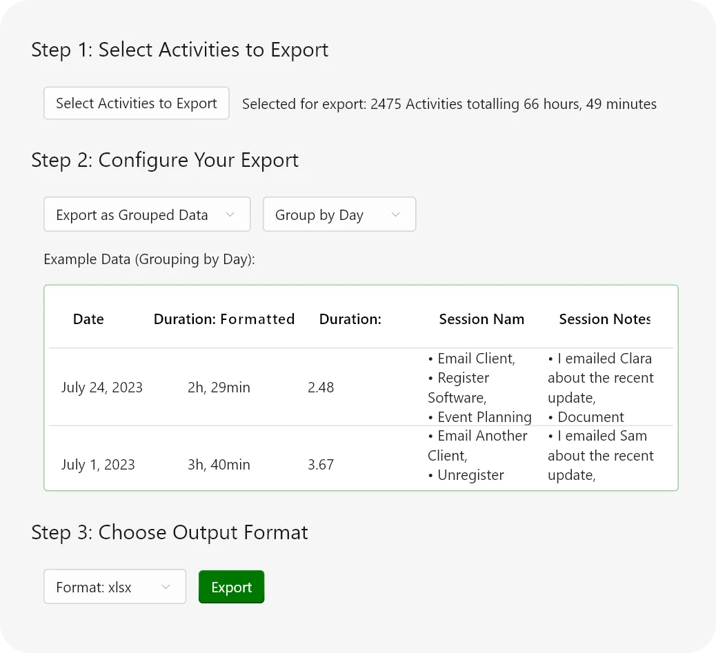 Anything you select and filter using Time Squeeze search can be exported. Time Squeeze helps you consolidate your work by allowing you to group activities by client, project, date, or application. Time Squeeze supports Excel, csv, and json files with more to come.