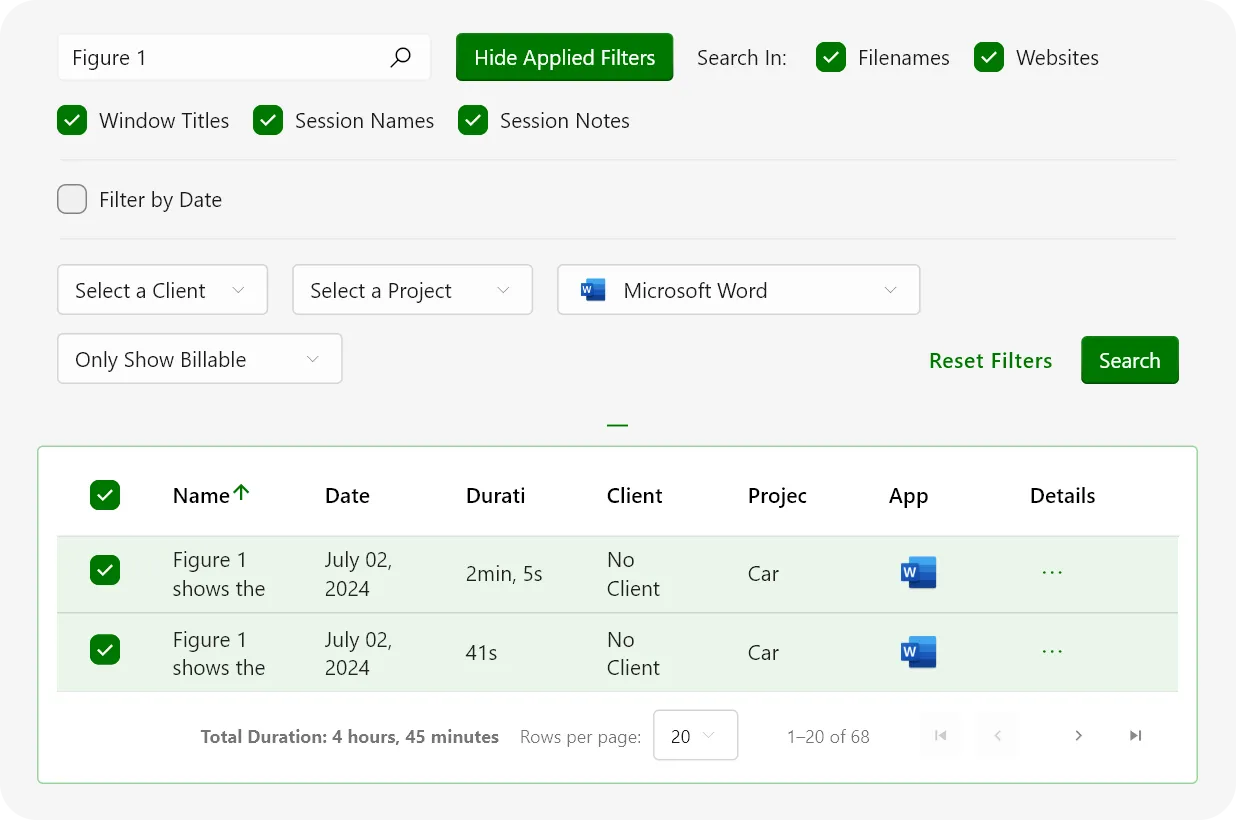 Time Squeeze lets you search for activities by client, project, keyword, date, application, billable status, and even website and filename. After searching, you can sort by name, date, duration, etc. Ever wonder what that one website was last month? Time Squeeze can help you find it in seconds. The search functionality is available from any page in Time Squeeze and can be accessed with 'CTRL+F'.